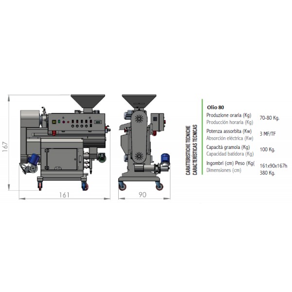 Minifrantoio a freddo con capacità produttiva di 70-80 Kg di olive/ora. Indicato per una produzione giornaliera nelle 8 ore di circa 600 Kg. Massimo assorbimento: 2,8 kw ora